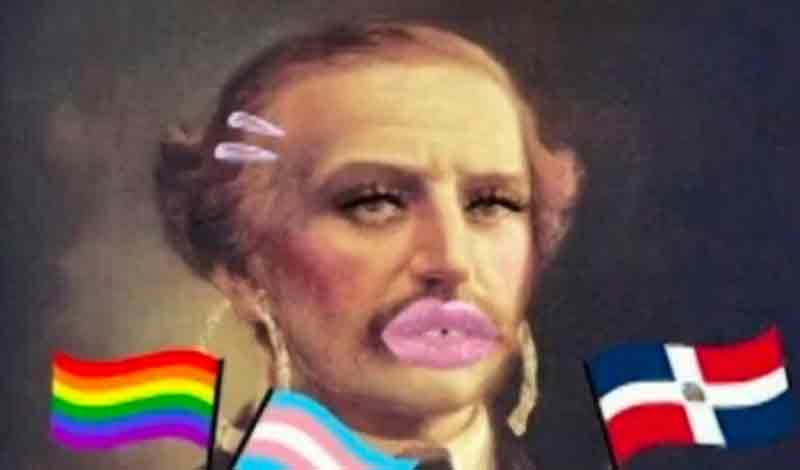 En la imagen se puede apreciar al patricio con labios gruesos, maquillaje, aretes, pestanas y varias banderas de colores en sus manos, lo que se interpretó como un Duarte homosexual.